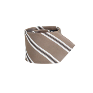 This brown and white striped necktie is designed for formal and professional wear, featuring a classic striped pattern in neutral