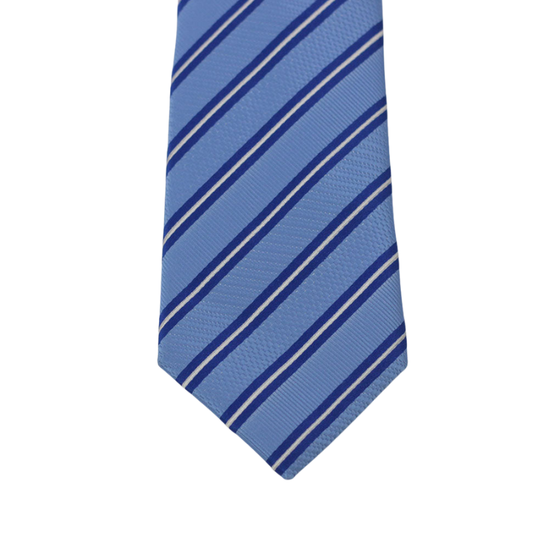 This blue and white striped necktie is designed for formal and semi-formal wear, featuring dark blue and white stripes set on a light blue base. The slim profile offers a modern appearance suitable for office wear, business meetings, and formal occasions.
